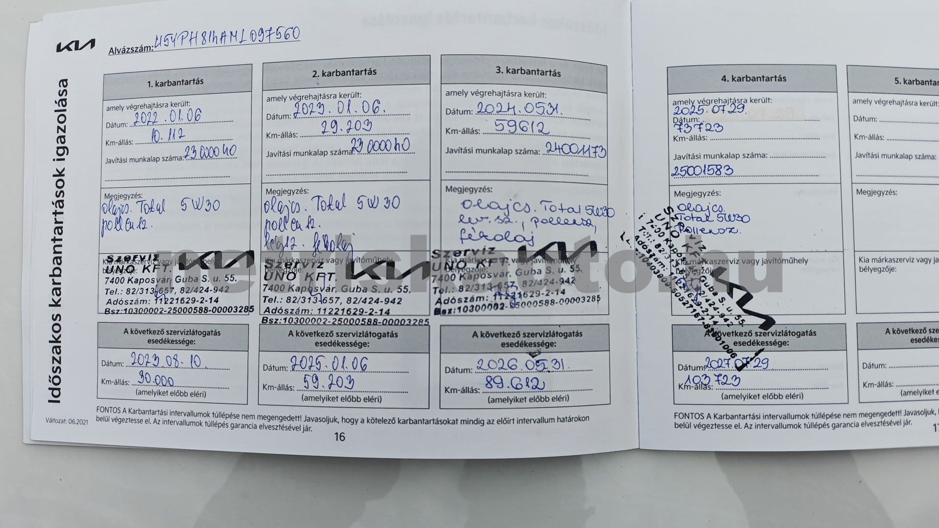 Modell fissitett kivitel, 2028 augusztus 10-ig, illetve 150.000 km-ig garanciális, első tulajdonostól, nem dohányzó, garázsban tartott kiválló állapotú gépkocsi. A gyári 30.000 km helyett 15.000 km-ként volt olaj+szűrő csere, végig a kaposvári Kia márkaszervizben szervizelve. Alvázszám: U5Yph814AML097560 Gold felszereltség feletti extrák (közel 2.000.0000 Ft értékben): LED fényszórók (automata kapcsolású távfényel). Üveg napfénytető nyitható + eltolható + motoros belső árnyékoló. Gyári levehető vonóhorog. Gyári Kia 4 db-os gumiszőnyeg készlet. Műanyag csomagtér tálca. Utólagos biztonsági sebváltózár. Alvázszám az üvegekbe gravírozva. Alvázszám az kaszni elemeibe UV-gravírozva. Vezeték nélküli mobiltelefon csatlakoztathatóság. Kia új hibrid (alufelni hatású) acélfelni téligumi szettel. Átlátszó (vastag) kavics/jégvédő fólia (első lökhárítón, motorháztetőn, első fényszórókon, tükrökön, ajtóéleken, hátsó lökhárító tetején a csomagtérnél).